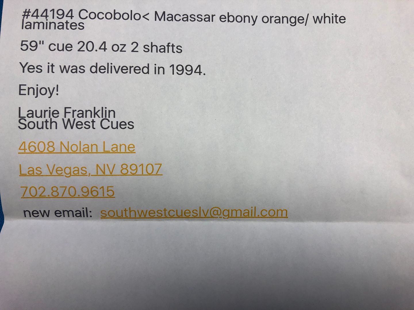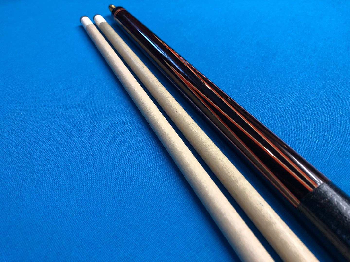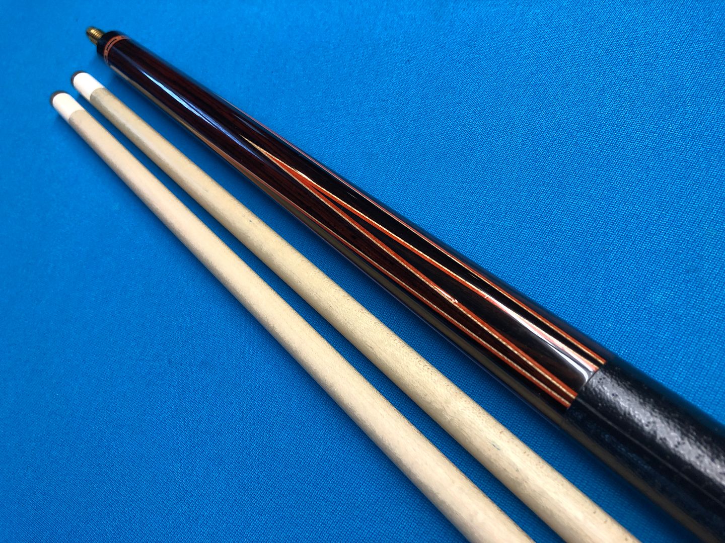 The cue has 6 points of Macassar ebony into highly figured Cocobolo. Two veneers of orange and white. The cue is 59” long and weighs 20 oz’s. Two shafts with ivory ferrules at 12 mm. The cue has a couple very small finish nicks and the leather wrap was installed by Mike Webb and is perfect.