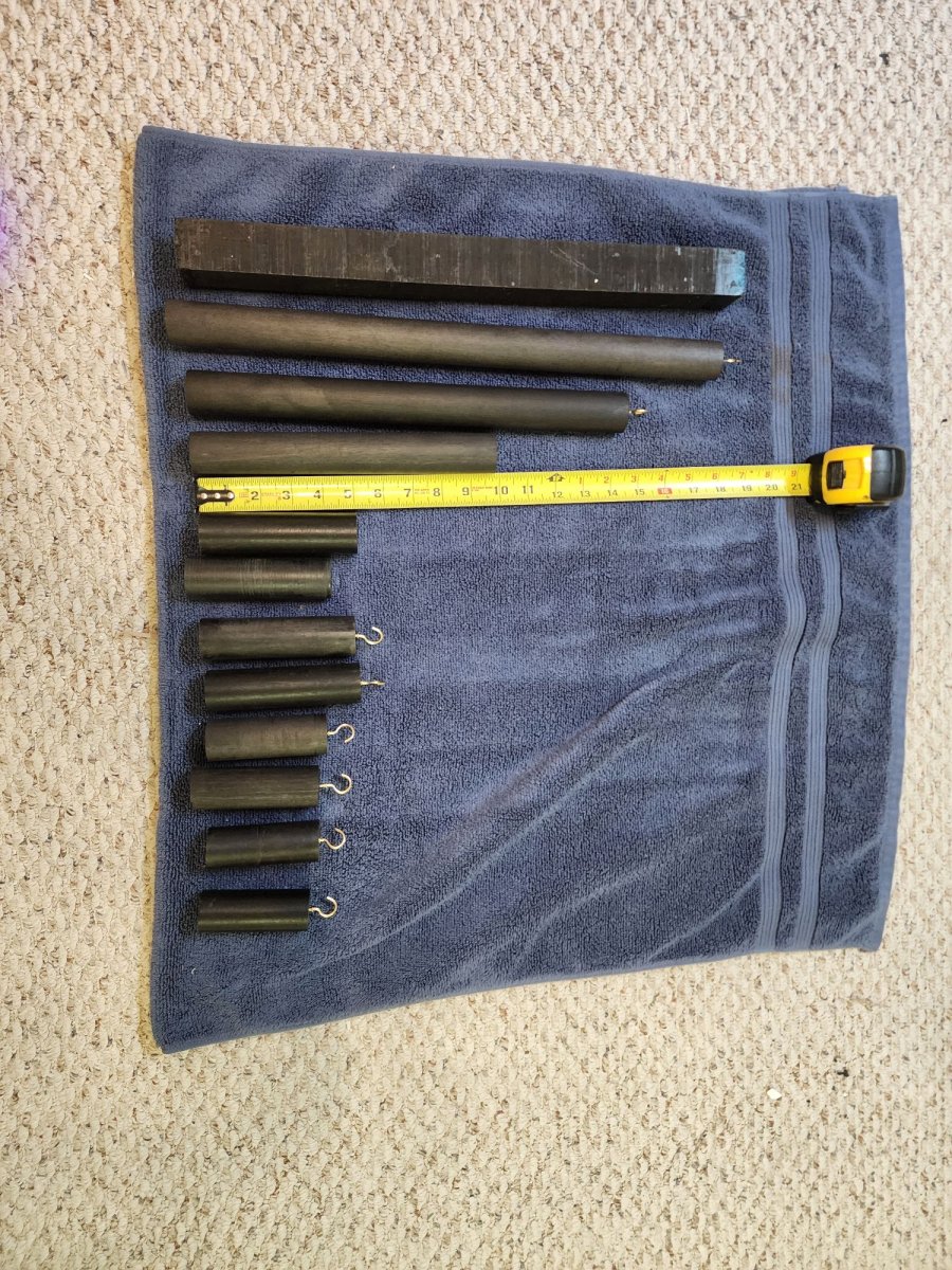 Misc ebony wood. All round pieces are atleast 1.350. 2 short pieces without hooks are drilled .775. Lengths per tape measure in picture. $200 SOLD SOLD SOLD Paypal as payment.