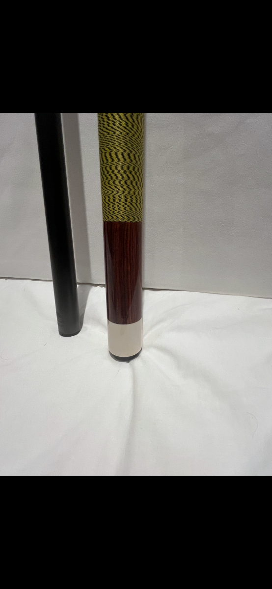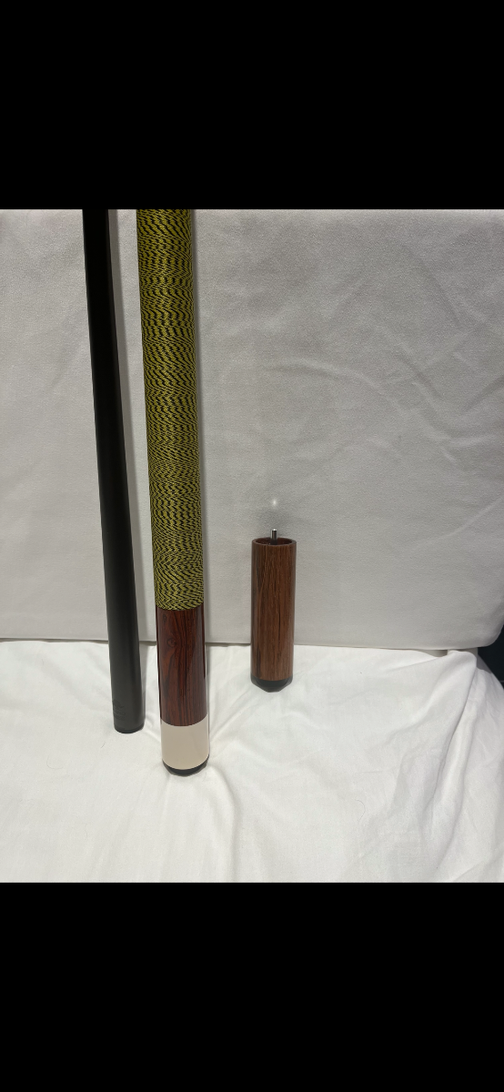 Ed Robinson 4 point flame veneer custom cue. Refinished by Anthony Milanesi with new wrap and amazing clear coat finish. 3/8x10 modified pin, 30” butt. Comes with 30” Rhino shaft (12.5mm) with newly installed Ultra Skin Medium tip. Weight can be adjusted as requested. Also comes with 4” extension. The cue has two very small blemishes in clear coat on the forearm where it recently fell over. It may be able to be buffed out, only visible if your looking for it. Otherwise a very nice player with unique color scheme. Can sell butt alone for $400.