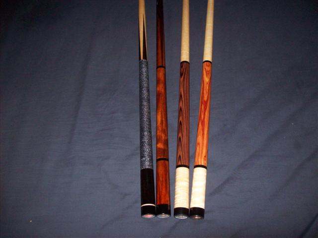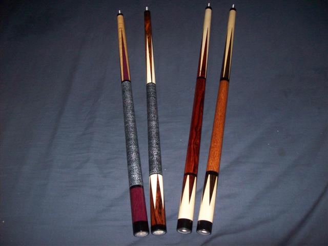 I would like to move these cues quickly. So I'm ready to wheel and deal with some good prices.All shafts have LBM ferrules.All shafts for these cues weigh from 3.9 to 4.1 ounces.Each cue comes with one shaft. First cue is a maple forearm with 4 purpleheart points a purpleheart buttsleeve with black and white linen. Weight 19. Price 375.00. The second cue has a cocobola forearm and butt sleeve with 5 holly points with black and white linen. Weight 18 3/4. Price 550.00.The third cue is amaple forearm and buttsleeve with 5cocobola points. It has a cocobola handle. Weight 19 1/4. Price 400.00 The fourth cue has a maple forearm and buttsleeve with 5 zircote points. It has a leopardwood handle. Weight 18 1/2. Price 400.00 The fifth cue has a maple forearm with 4 ebony points an ebony butt sleeve with black and white linen. Weight 18 1/2. Price 300.00. The sixth cue is a cocobola forearm and buttsleeve with 5 redheart points. It has a bubinga handle. Weight 20 1/4. Price 400.00 The seventh cue is curly maple with a kingwood handle. Weight 19 1/2. Price 325.00 The eight cue is birdseye with a tulipwood handle. Weight 19 1/4. Price 325.00. Thanks for looking. Steve Klapp 309-509-2020