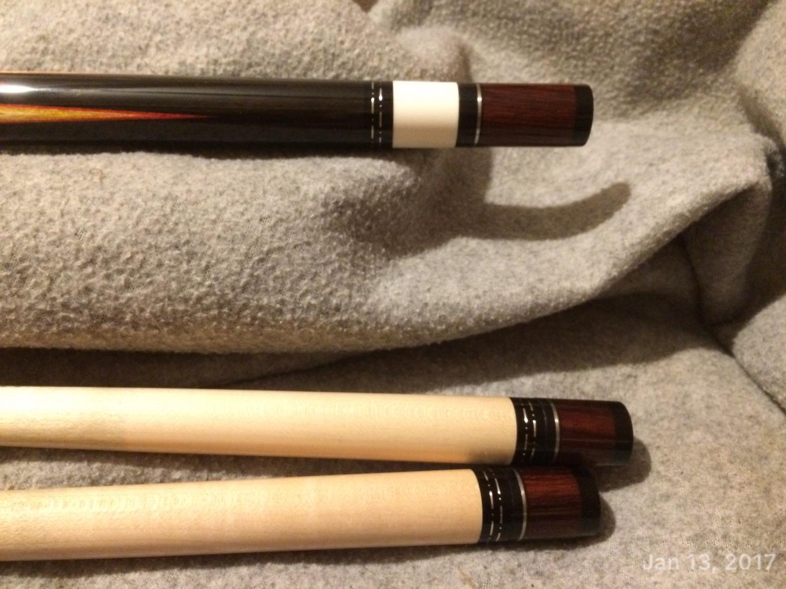 Shafts with ivo ree ferrules, one lightly played, one test hit. Good layered tips and tight grain. Both weighing just over 4 ozs. Will include the fancy joint protectors for a quick easy sale. Asking 1600.00 boo. Case not included.
