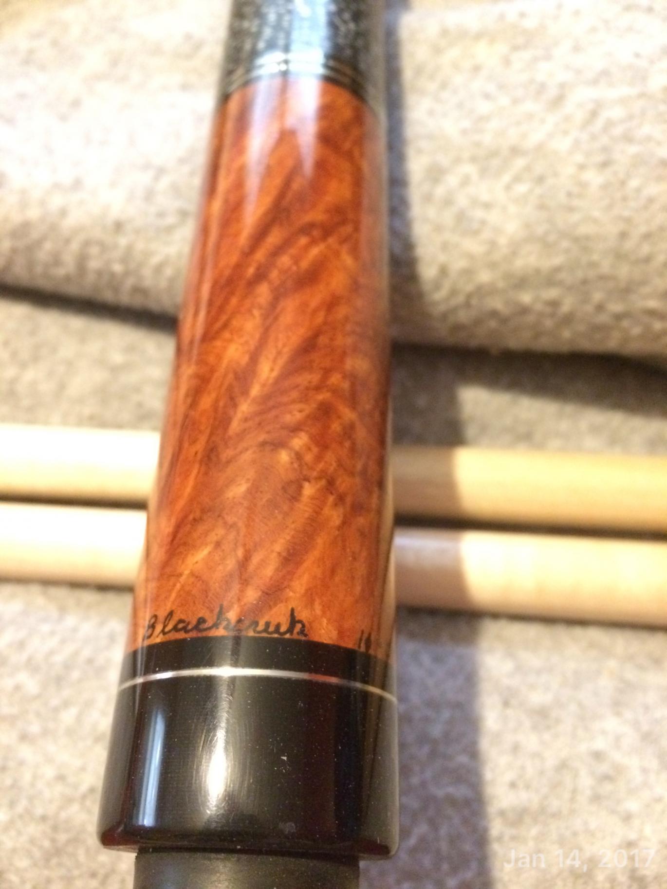 Amboynia recut points on flame veneer rainbow spliced ebony butt with amboynia sleeve on butt. Black linen wrap, stainless joint pin with flat face and juma sleeve, fancy silver rings at all points. If memory serves me the butt is a hair over 15 ounces. Two