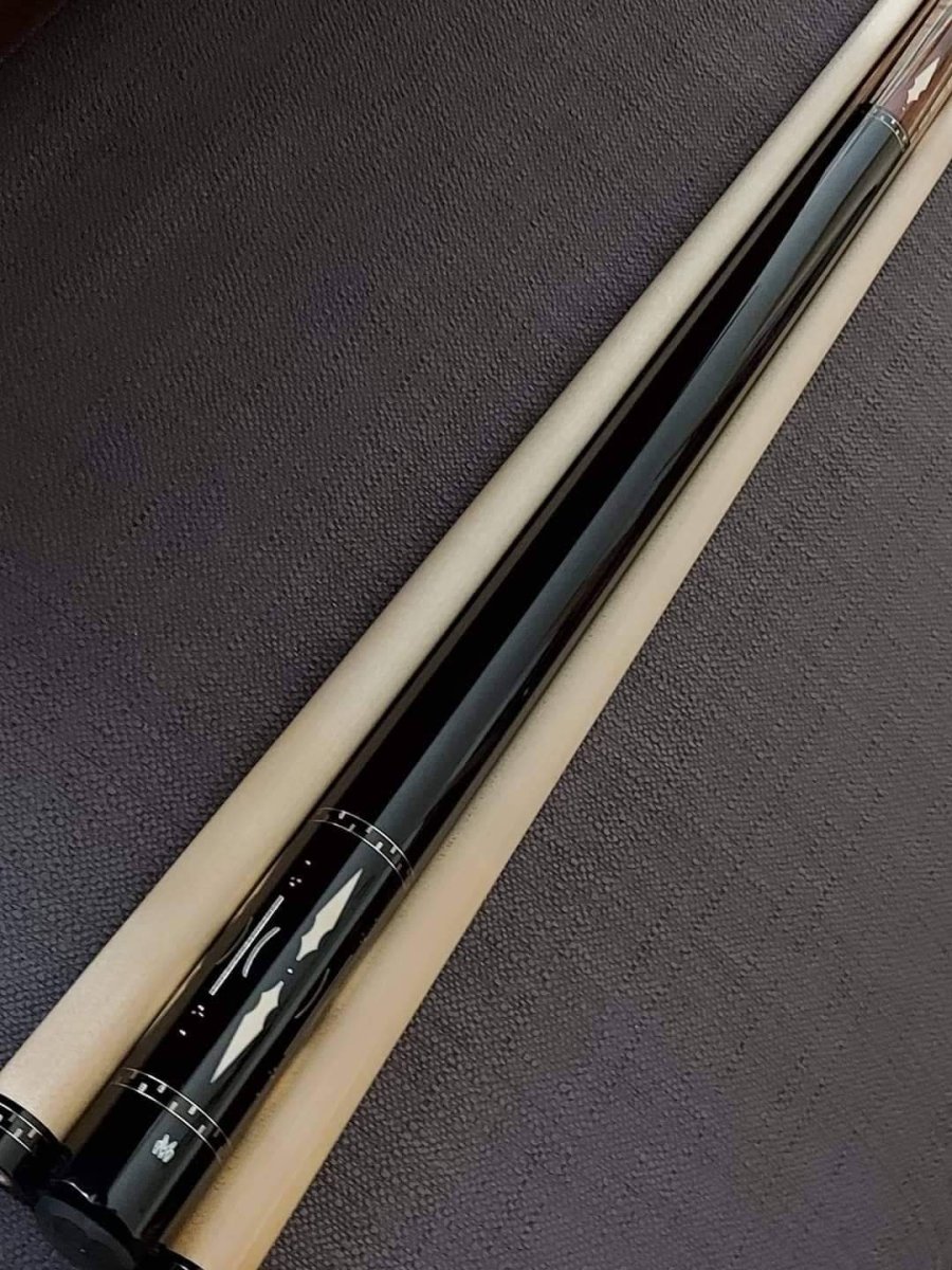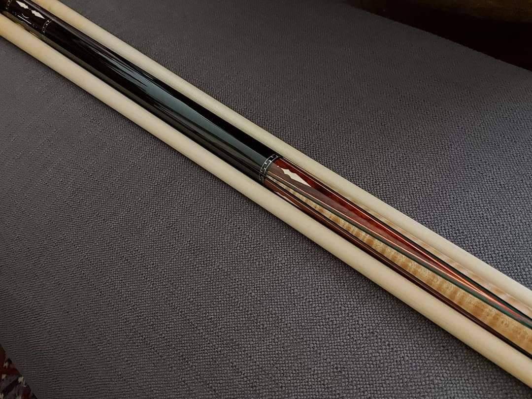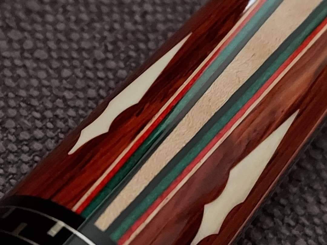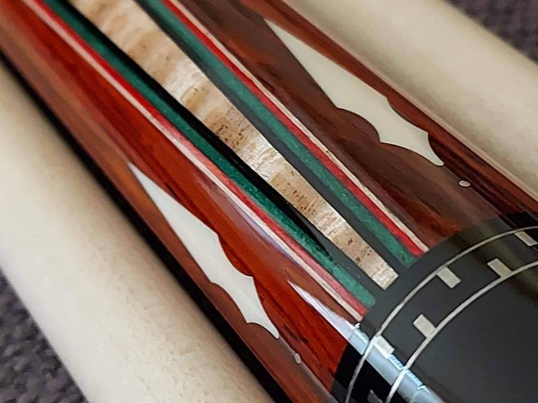 You don't see them for sale very often and there is a good reason for that. They are one of the best playing cues you can find. Perfectly balanced with very stiff hit to them and this one is no exception. It is beautiful 4 points Cocobolo into BEM with Ebony handle and Ebony butt sleeve. It has recognizable Ernie's silver rings and 52 inlays in silver and ivory. It is one of the best playing cues i have ever had.