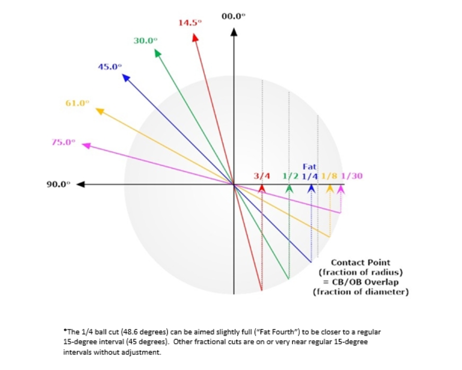 The description I explain of how to determine the exact contact point can account for any and all contact points to achieve any cut angle. You do not have to memorize any specific lines, angles and points. You are free to clock reference any point on the outer edge of the object ball.