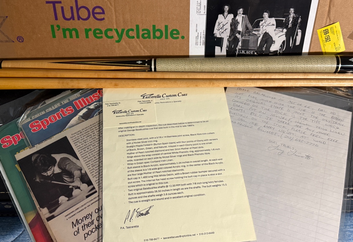 Although these cues go once in a while outside to play, they rarely go to a crowded place anymore where people don't care who's cue it is and start playing with them. The third from the right is Larry Lisciotti's George Balabushka purchased from Pete Tascarella family.