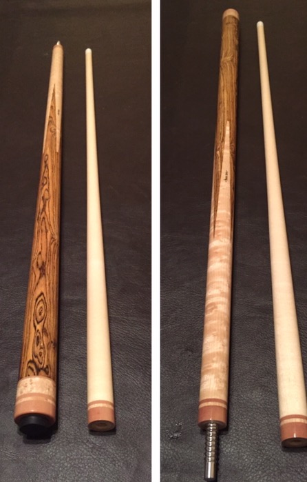 Josey custom cue Birdseye maple forearm Bocote butt Birdseye maple Southwest style ring work butterscotch phenolic joint and collar