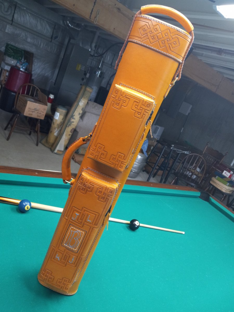 Here is one, built to suit, for a customer who gave us just a few guidelines. He supplied the parameters for his family initials crest, told us he liked blue, and that he needs good access to his accessories.