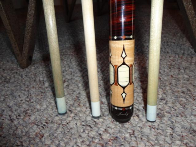 PRICE DROP!!Here is a 1 of a kind Jacoby that has seen little play and ran me over 1500and retailed for 2500 new. The cue has two origianal shafts one of wich is warped pretty bad so I am throwing in a shaft that does not match the ringwork but fits the cue nicely. The other matching shaft is straight. The butt weighs 15.3 two original shafts are 3.6 and close to 13mm the other shaft is 3.8 and close to 13 also. The cue has a stacked leather wrap with a clearcoat over top wich gives it a unique feel. Radial pin. The ivory sectioned points have some finish raise where you can feel the inlayes but other then that the cue has seen little play and is in good shape. Looking for OFF TO EBAY shipped or will look at trades for cue or a nice case. nateschade@gmail.com Thanks Nate