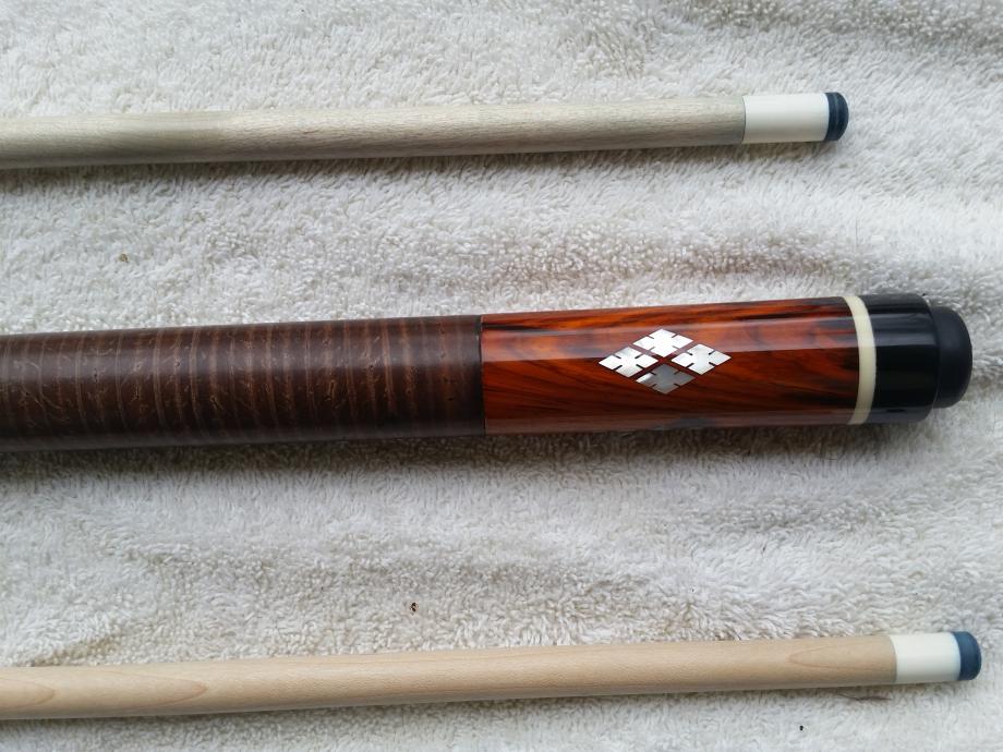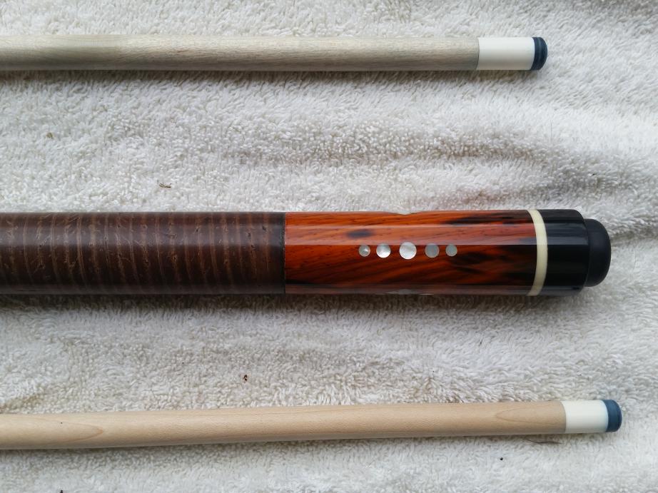Coca Bola Points, 2 Shafts, Ivory Joint, Ivory Ferrules, Stack Leather Wrap. 60 inch Cue. Zan and Cyborg Tips.