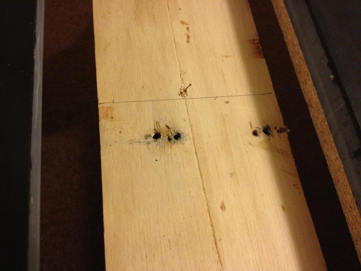 i'm not sure that i can enlarge and plug... look how close these are? this is the C6/C7 area (middle & end slate, center). there's definitely 2, maybe 3 holes with that kind of spacing at all the other locations (16 screw holes total) (the marked line was put there by me to use as a reference point for my level and is not located at the exact centerline. nor is that groove. not sure how/why it's there, but not for positioning purposes either)