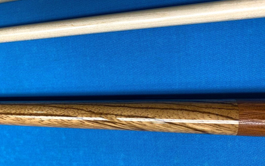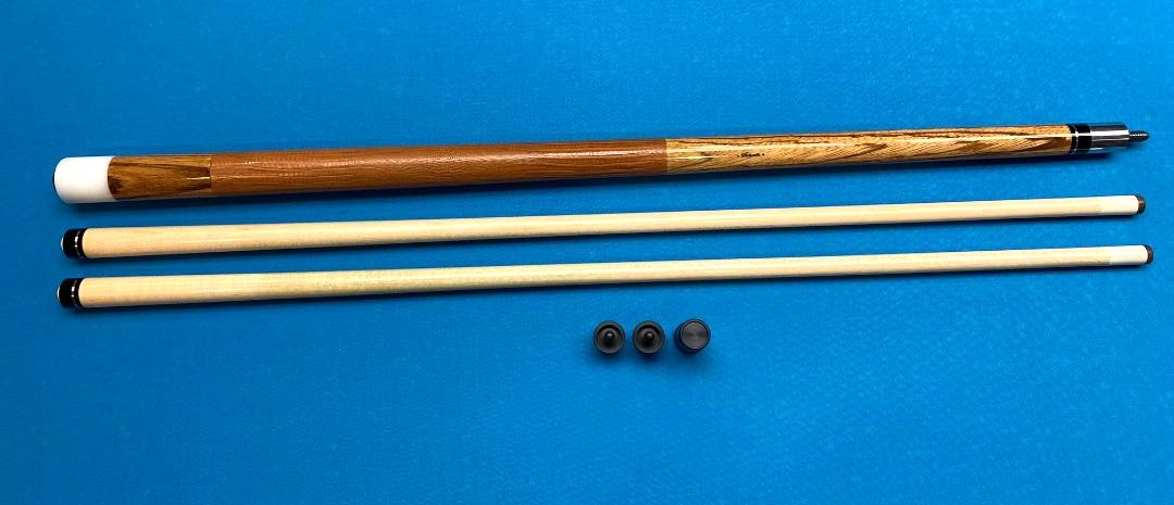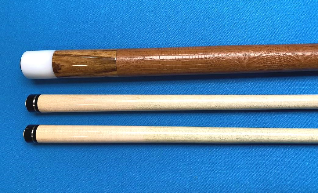 Up for sale is another super nice Tascarella cue. This one is a merry widow that features a spectacular blondish colored big grained wood that Pete just told me he believes is madagascar rosewood. The cue has two amazing full shafts, everything rolls straight both together and apart and plays like what you would expect from a fine Tasc. The hit is firm and crisp providing wonderful feedback along with that nice note when striking whitey. Cue also features a brown lizard wrap that the Tascarella shop did their usual magic on - good luck finding the seam.