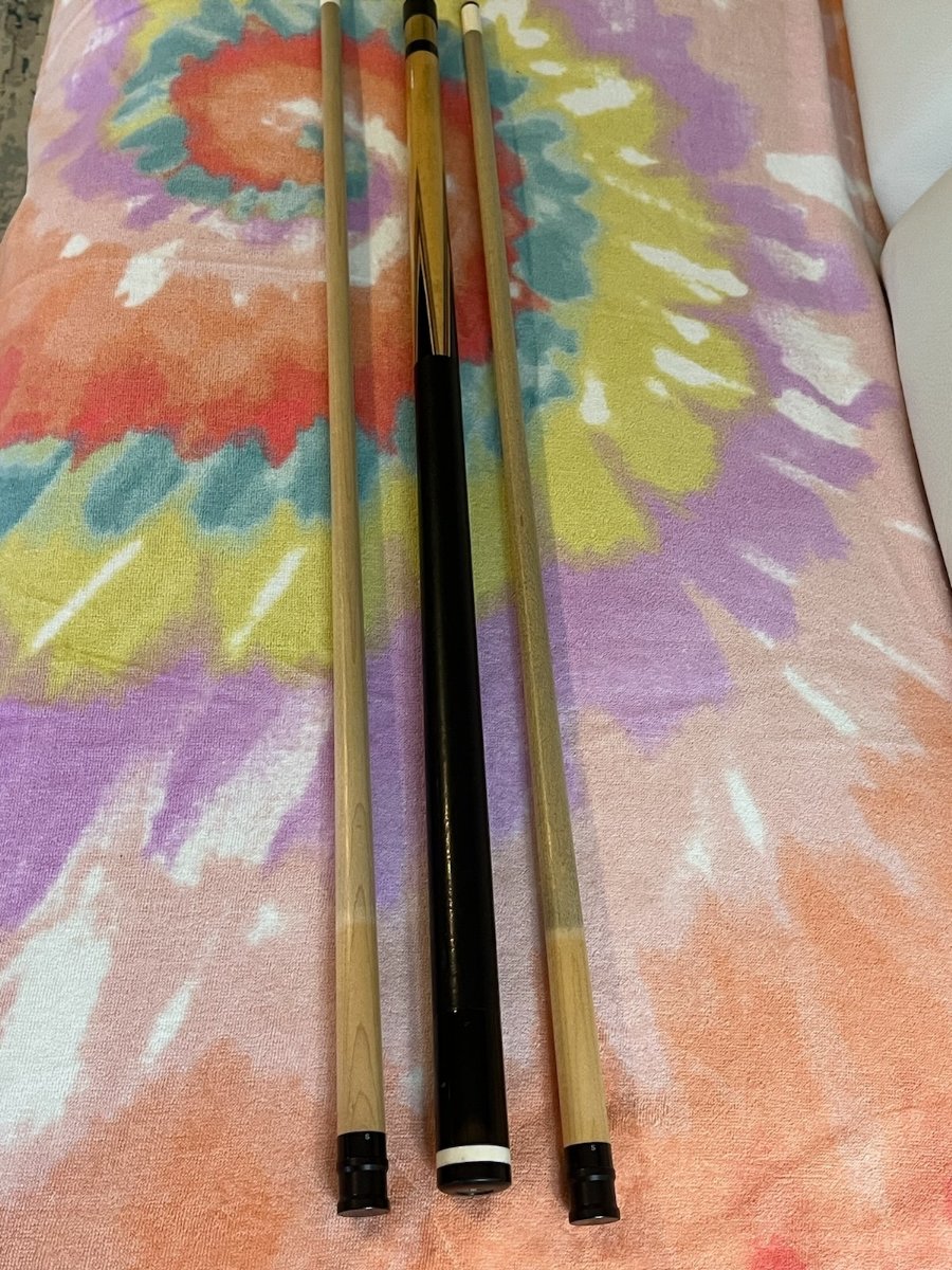 Restoration/shafts/New Black smooth leather wrap by Dennis Searing. After a month finally got back the cue with shafts that Now have Dennis Searing ivory 'S' on the shafts. Both shafts were refaced along with the joint.