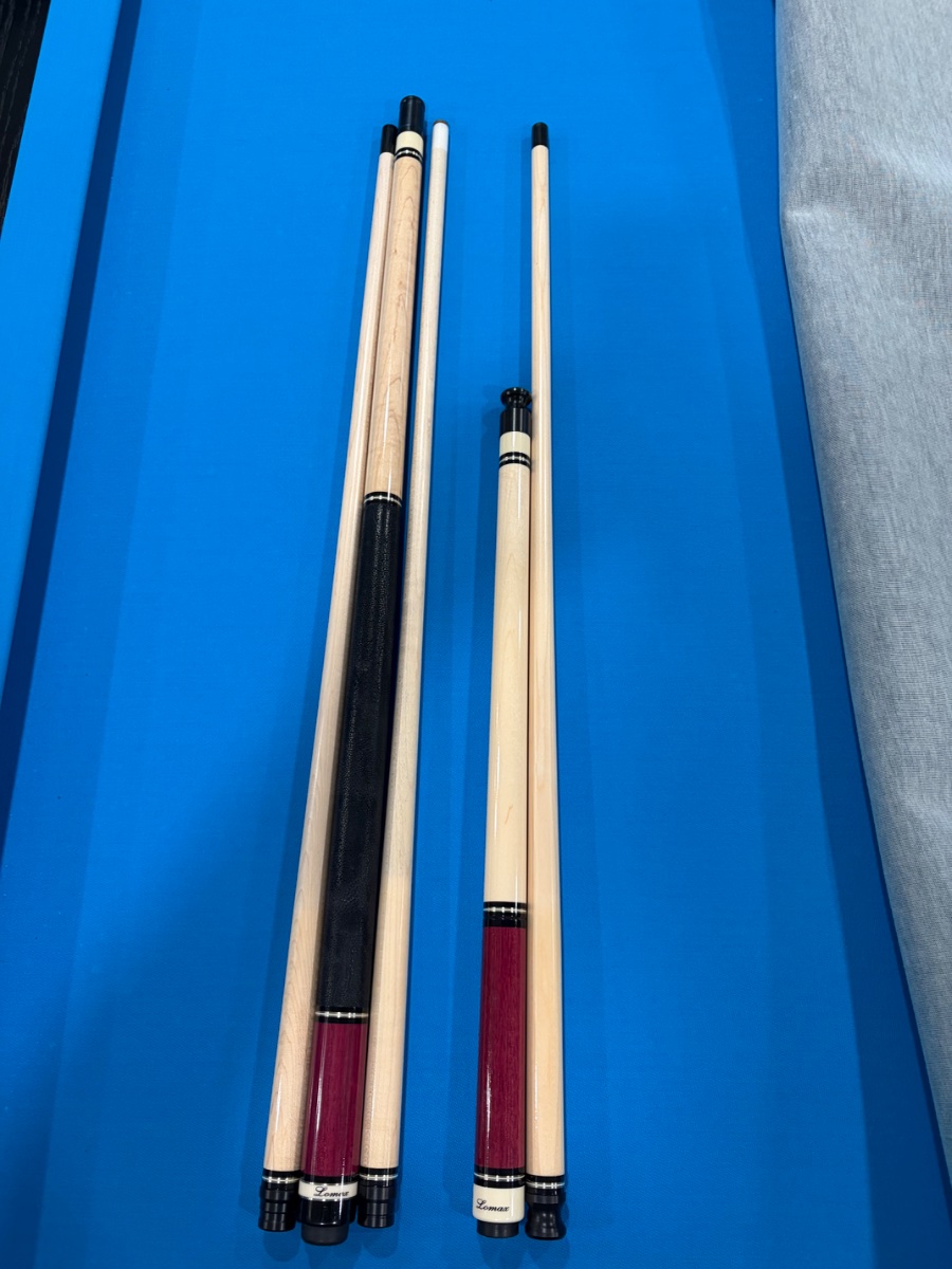 Matching set of nice cues, very light use in great condition. Purple Heart, and real elephant ear wrap. 58” cue, butt is 15.6 oz and shaft 4.13 with 12.9 diameter with extra break shaft, 3/10 modified pin. Steve is known for his craftsmanship as well as great jump cues. I play with a longer set up now, no longer need.