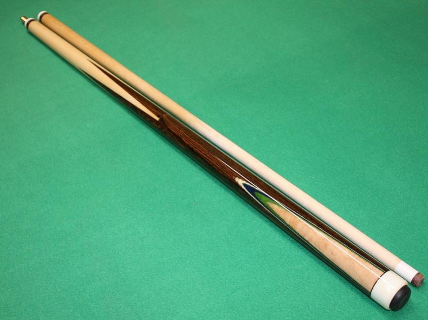 For sale is a new cue built by both Reuben and Bryan Fisher. Bocote sneaky with 2 Tiger Maple butterflies with green, blue and white veneers. Ivorene joint and buttcap, brass rings.