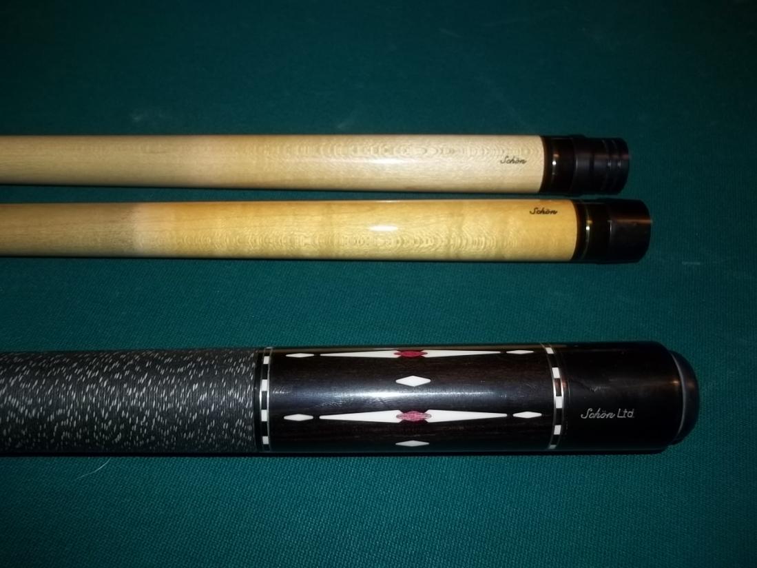 Nice Schon LTD cue, unknown model, with 2 shafts and is in great shape. The shafts and butt are nick and ding free. The shafts are apprx 12.9mm each. The cue with either shaft has a very minimal roll, does not effect playabilty. The cue weighes apprx 20 ounces. Price is $SOLD.