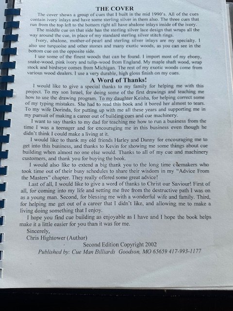 The Cue Building Book By Chris Hightower From Tree, To Tip, To Trade Show! Second Edition 2002 $45 shipped CONUS