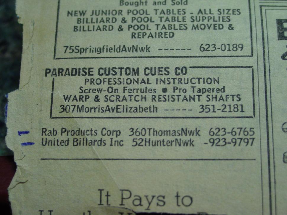 I don't know you but I believe that Frank Paradise is the most underrated cuemaker of the 1960's. He started trends that are still done today. I have said this multiple times, and even have a great web page with information about Mr. Paradise and an old interview posted. Being from NJ, and growing up very close to the epicenter of the NJ cuemaking universe, I've seen a lot of cues.