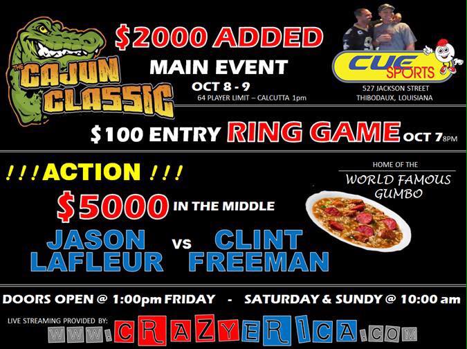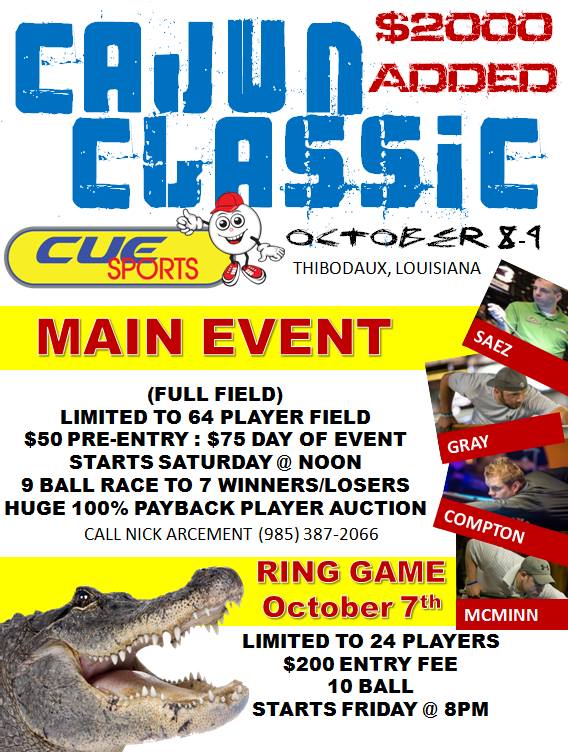 And Sat/Sun, sweat the $2,000 added Cue Sports Cajun Classic 9-Ball!