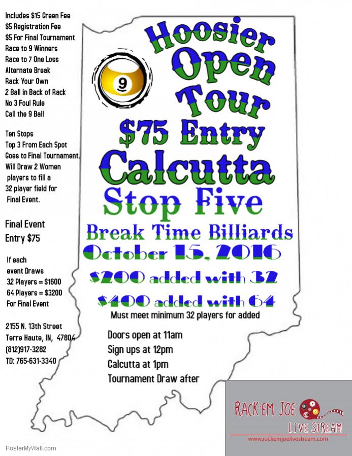 Free Live Stream for Stop Five of Hoosier Open 9-Ball Tour coming up Oct 15th. In the mean time check out the on-demand at www.rackemjoelivestream.com