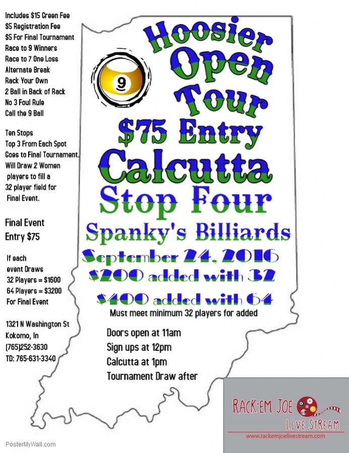 Coming up next weekend Stop Four of the Hoosier Open 9-Ball Tour at Spanky's Billiards. Thanks again for all the players who have supported this tour. Thanks to all the room sponsors as well.