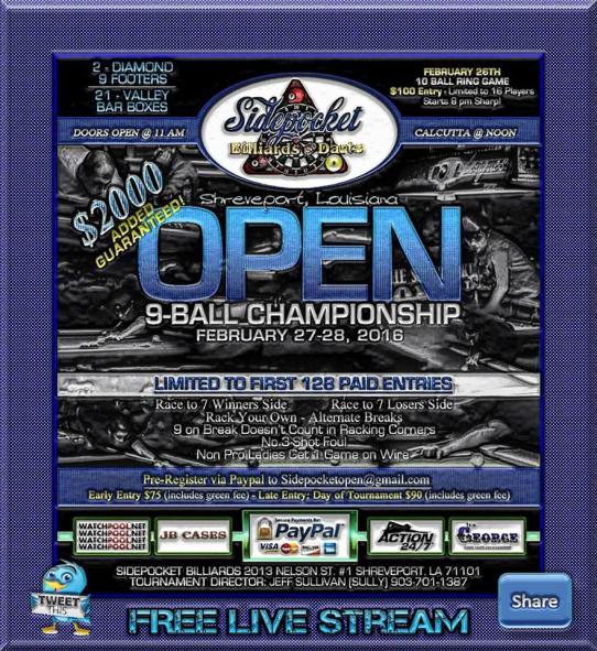 Free Stream Sidepocket Open $2000 ADDED Feb. 27th&28th Ring Game Feb 26th