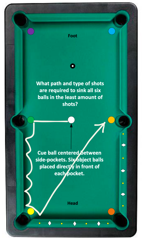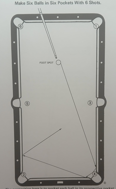 Recently I saw this beginners drill on line and decided to use it for my beginners group. The simple object of the drill was to sink each ball without scratching. As I was testing it out, it came across my mind that another way to approach this drill on a higher level was to try and sink all six balls in the least amount of shots. After trying for numerous attempts, I finally was able to sink all six with 3 shots.