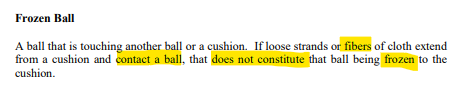 "Frozen Ball A ball that is touching another ball or a cushion. If loose strands or fibers of cloth extend from a cushion and contact a ball, that does not constitute that ball being frozen to the cushion."