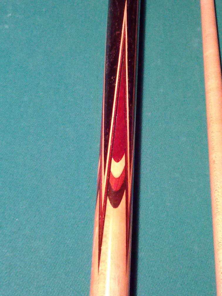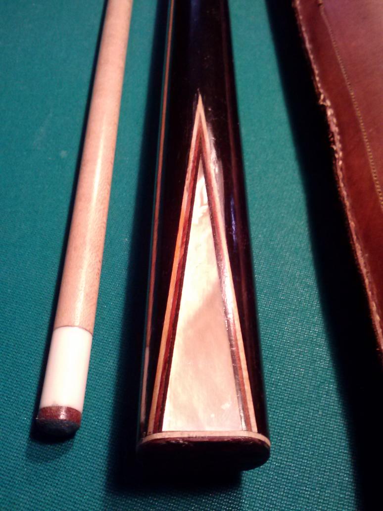 Brunswick 1880-1890 four point 3 veneer cue with butterfly points in between. Ebony butt with mother of pearl nameplate with 3 veneers that are also repeated in the buttcap. Solid ivory joint with big aluminum pin. Butt is perfectly straight and in terrific condition.Shaft is straight and smooth with the original ivory ferrule. Comes with a very unique case like I have never seen anywhere before. It is lined with a gold felt. In need of repair of the end cap stitching and replacement of the buckle strap,lid strap and strap that threads through the buckle.