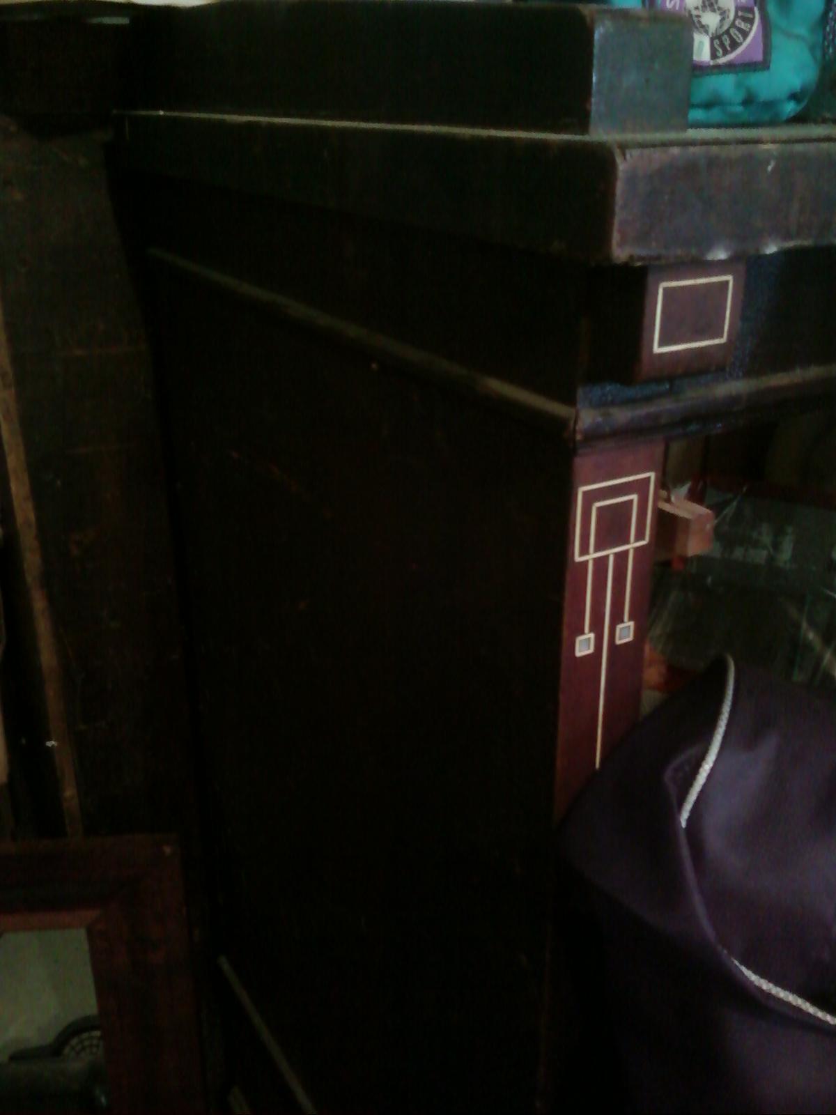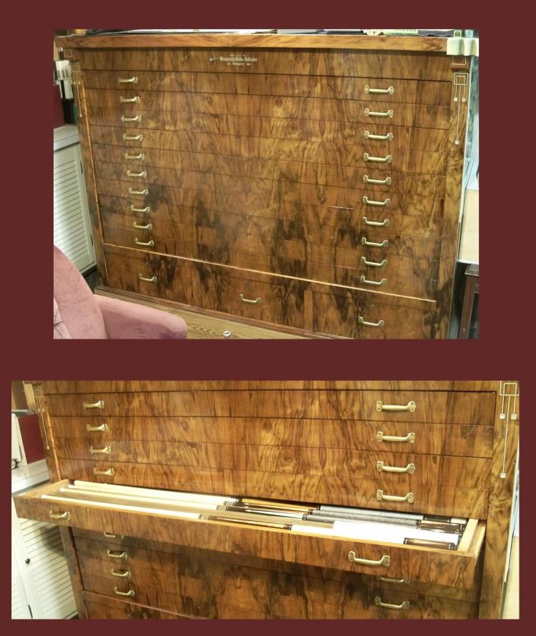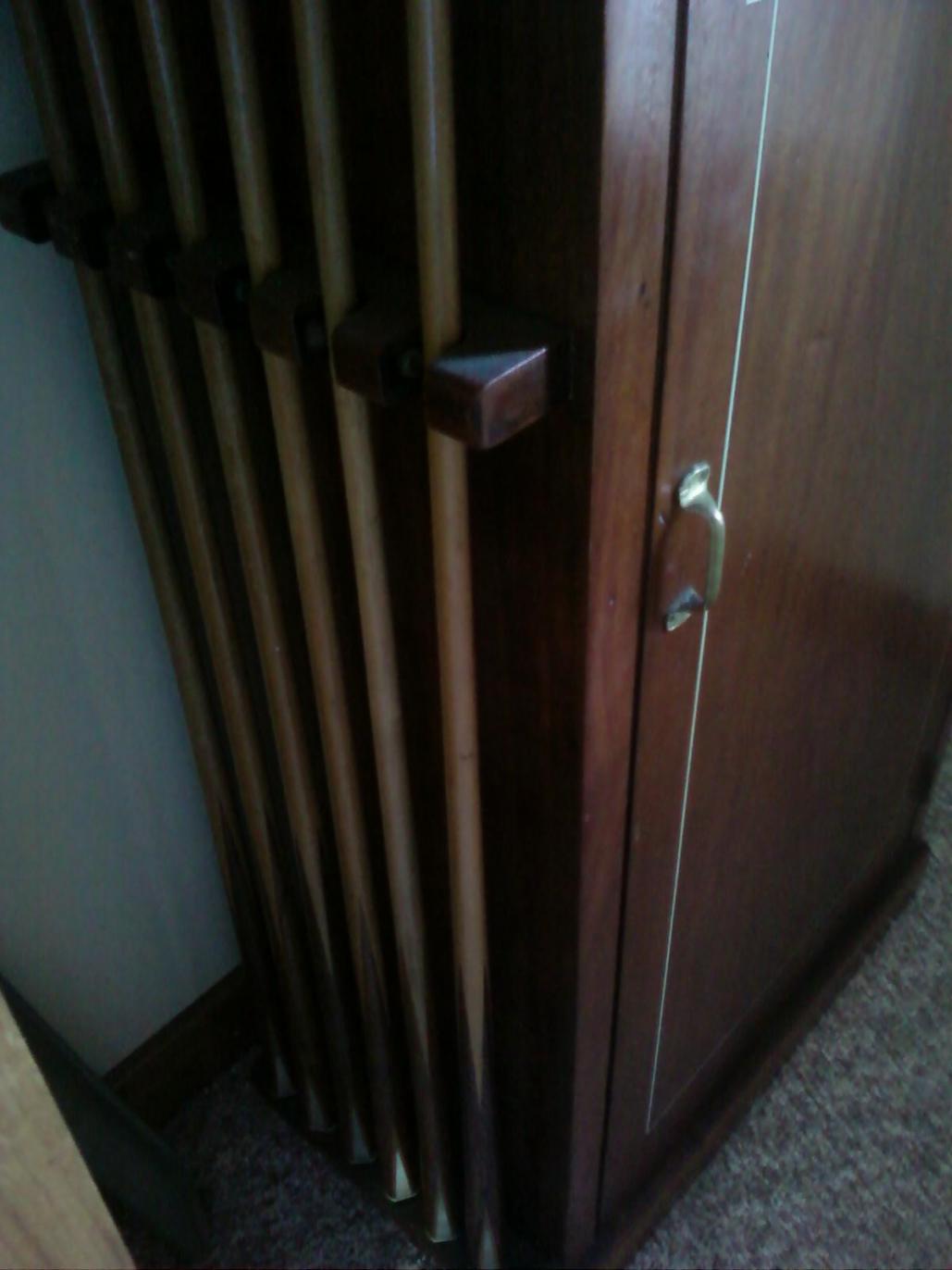 I have the #50 inlaid cue cabinet (10 cue drawers, 3 supply drawers); the #40 inlaid coat closet with original cue racks on sides (if you can even find one the cue racks are almost always missing and mine are perfect); #33 cue rack (center mirror is missing, costs about $150 to replace, and crown needs restoration); inlaid "cue bin" (10 cubby holes in top for 10 different weights of cues- they used to put these in the huge 1920s poolrooms where it was an inconvenient distance to the wall rack); inlaid 9-shelf pool ball shelf/rack; inlaid Arcade matching chair (Extremely rare item that was never in a catalog.) Some items need restoration, some not. The last item is the Brunswick catalog page featuring the Arcade, and I had a master woodworker find some matching ribbon mahogany and make a frame in the exact style of some of Brunswick's famous advertising, like the Archie Gunn Girl prints.