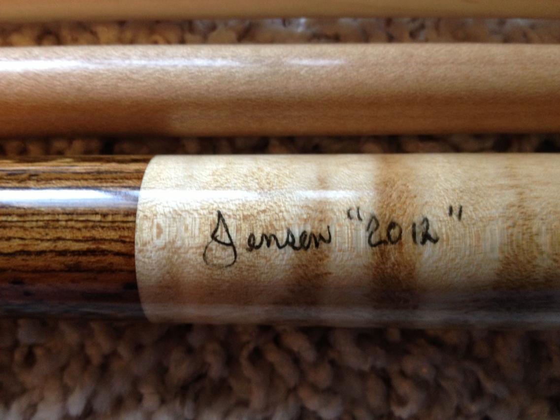 2012 Jensen wrapless with a curly maple handle and I believe it is bacote in the forearm and butt. This cue is an excellent player as most of Mike's cues are, I just can't get use to a wrapless cue.