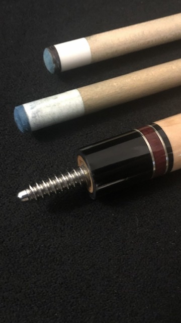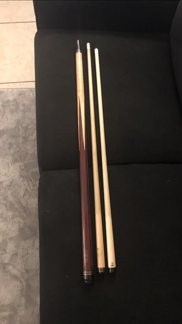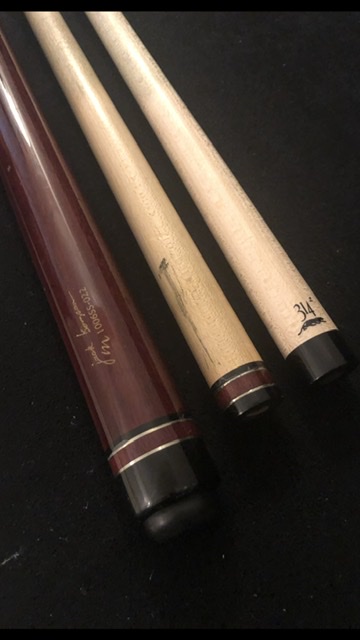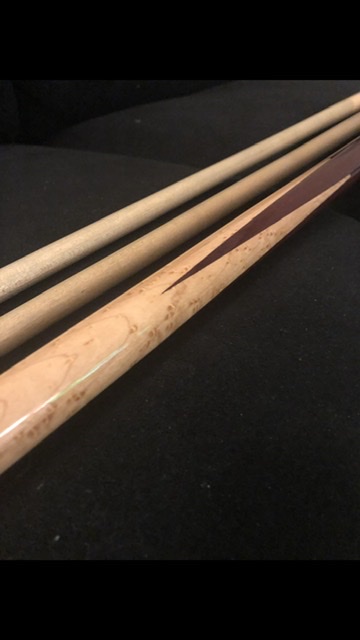 I have a 60” Purple Heart and Birdseye sneaky pete. 30/30 split the cue has some dings and a pretty good one in the lower part of shaft (see pic) it was a bar beater for many years. 3/8x10 pin rolls good I would say it has a slight roll to it to be safe. 12.8mm 19.5oz . Overall In good condition. Also I have a like new dead straight predator 29” 314-2 shaft that fits this cue