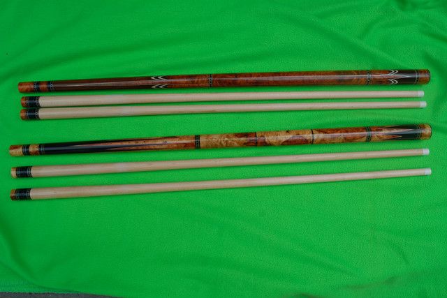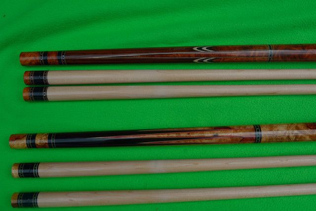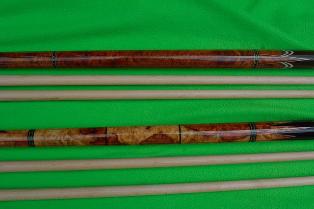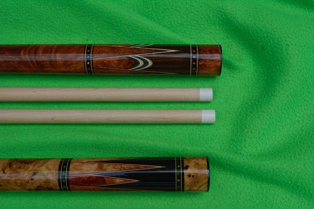 bottom cue is made from ebony forearm with 4 long and 4 short overlapping two tone amboyna burl points with maple and red veneers likewise to the buttsleeve,