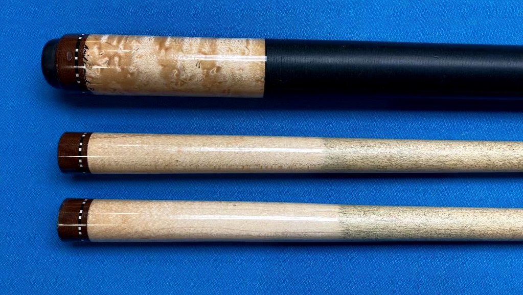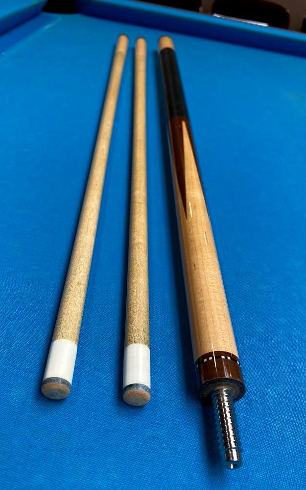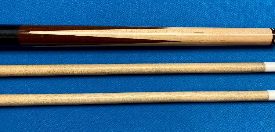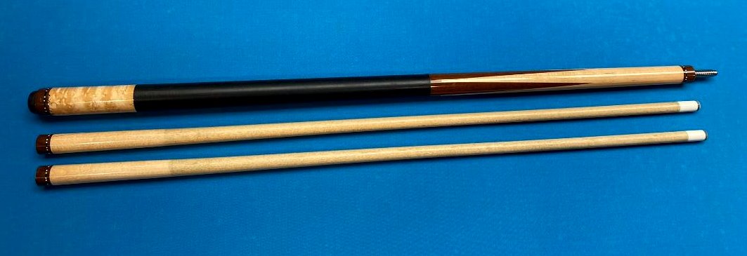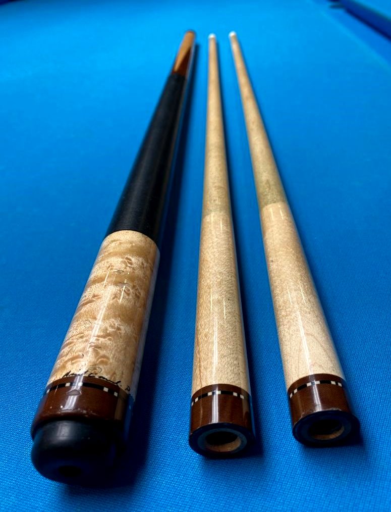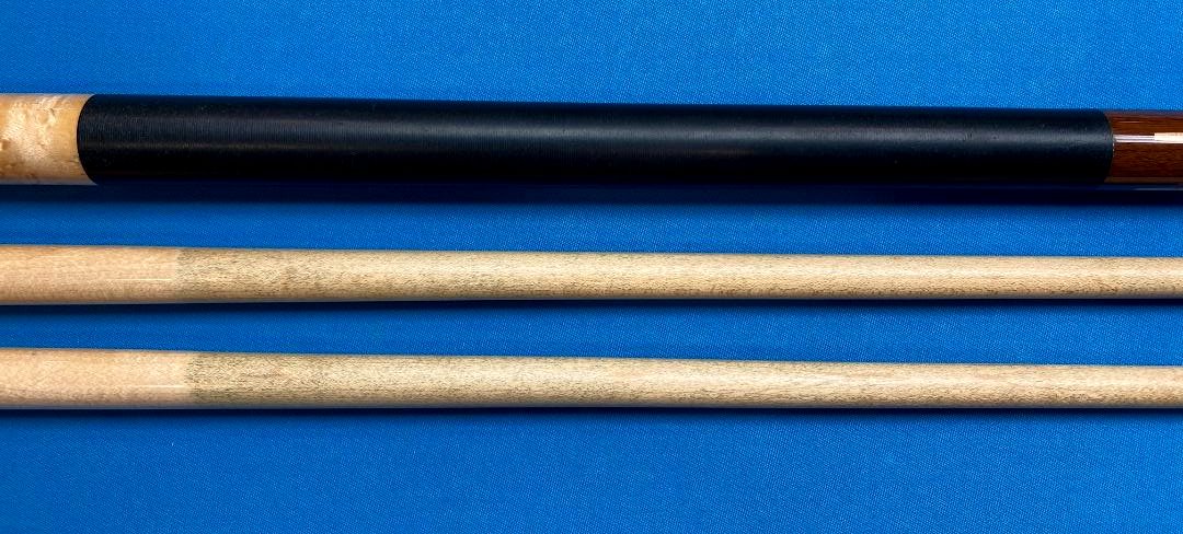 Up for sale is a very cool Ariel Carmelli fancy sneaky pete that plays incredible. I spoke with Ariel about it and he said he made a relatively small number of these about 15 years ago from Dufferins and he said they were wildly popular with his customers. The two shafts have an elongated pro taper and the hit is firm anbd crisp like I prefer with excellent feedback. I thought hard about keeping it for myself maybe as a bar cue but l just have way too many cues and must pare down. Whoever gets this cue will definitely see why I was trying to justify keeping it. Cue is in VG used condition with some signs of normal use.
