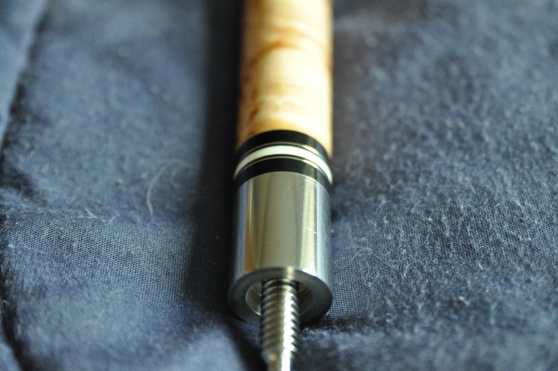Butt is Birdseye maple forearm, ebony points and ebony hoppe butt with white and green speck Irish linen wrap that’s original and still looks great. 5-16/14 piloted stainless steel joint with decorative ivory and stainless rings at positions D and E. Butt weighs 15oz. 4 veneers from outside in (Black, Green, Black, Green). Points are even.