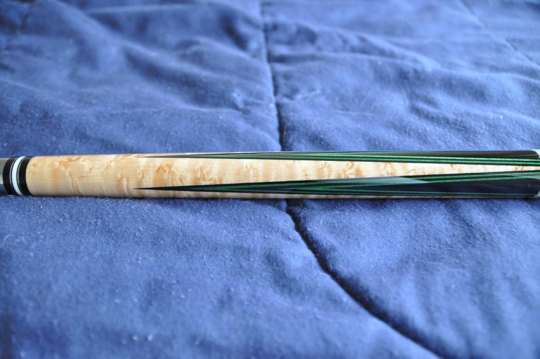 Here is a great player with a bunch of shafts so you can pick and choose what type you really want to shoot with. I used to play with this cue all the time and hate to let it go as I really love green veneers. This cue is in outstanding shape. All white is ivory and so are most of the ferrules. Cue is straight.