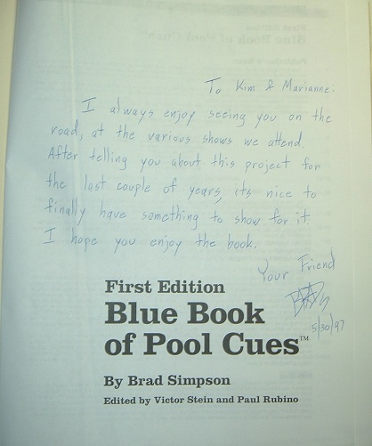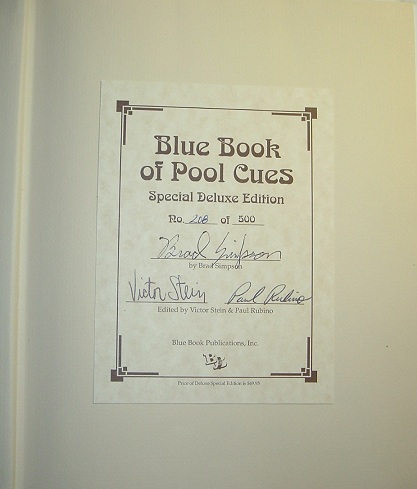 I have a Blue Book of Pool Cues, 1st edition hardcover. The book is in excellent used condition with a few small blemishes to the back cover and at the very edges of the book. On the first page is a personalized inscription from Brad Simpson that has a crease that runs along the length of the page. On a scale of 1-10, I'd rate the condition a 9.5.