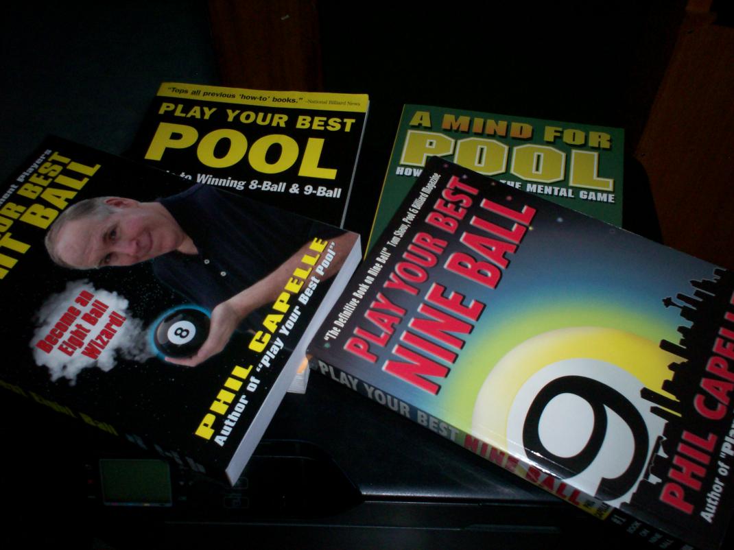 MOVED TO EBAY four Capelle books. A Mind For Pool, Play Your Best Eight Ball, Play Your Best Nine Ball, all in new condition. Play Your Best Pool, in good condition. paid $120.00 new. adding The Best Damm Pool Instruction Book Period by Ron Schneider DVD, also.