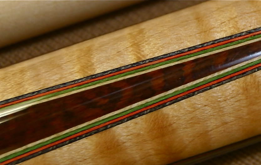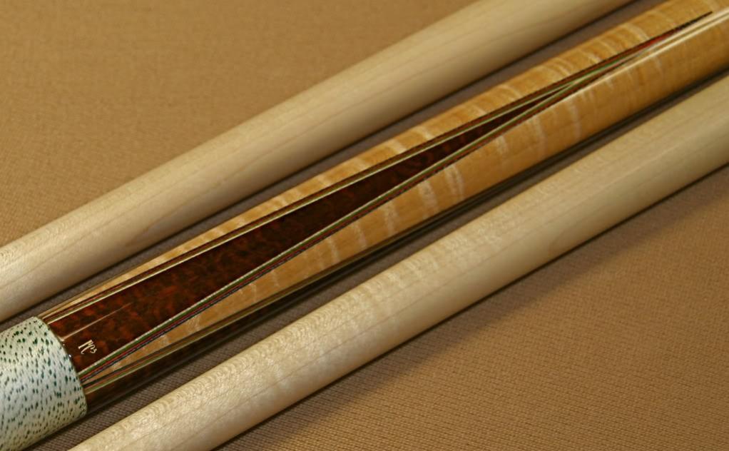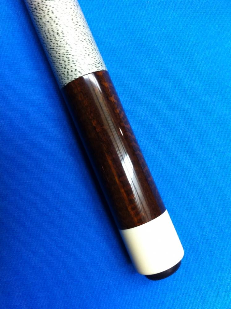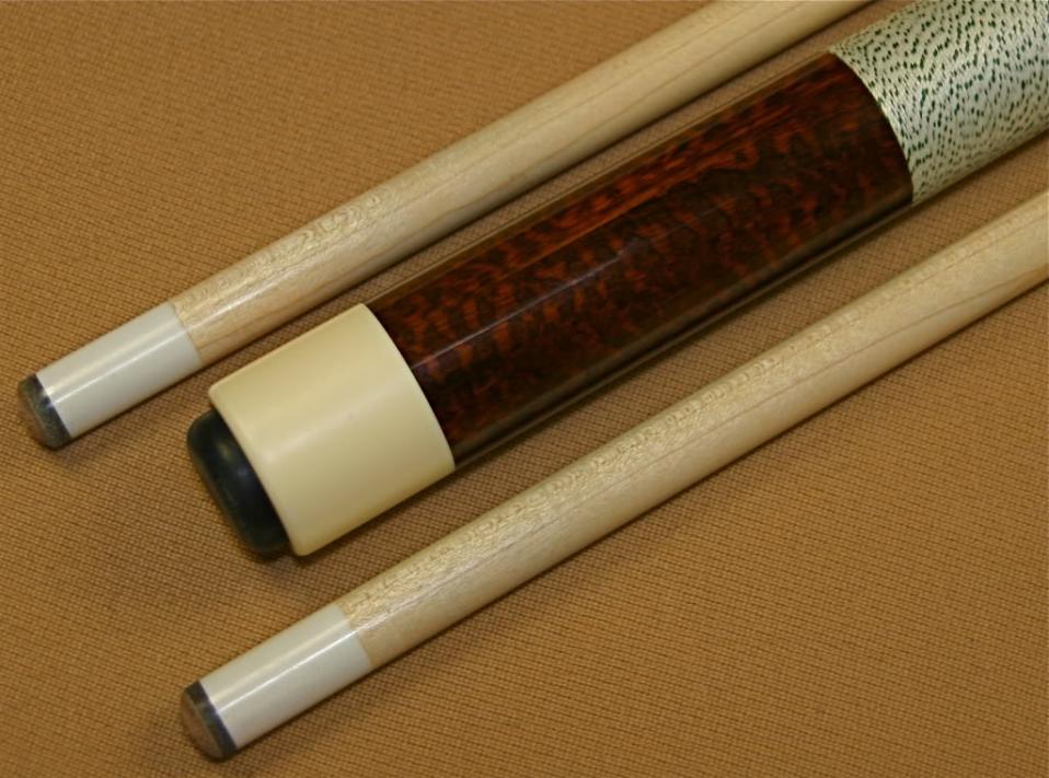 Specs: Four snakewood points, with black/grey, red, green, and natural veneers. With a white/green speckled linen wrap and a segmented snakewood butt sleeve, which is beautiful. Standard length, with two 13mm shafts. Everything is clean and minty. No visible bluing on the shafts and both tips are excellent, one seems unchalked.