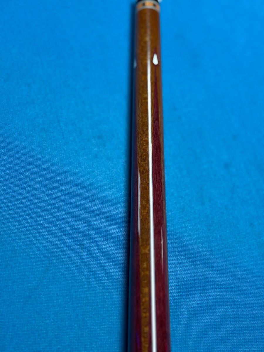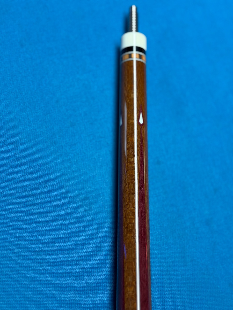 4 pointer diveney cue with gorgeous wood combinations. Segmented tulipwood handle, leopardwood and Purple Heart points.