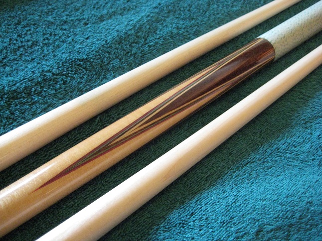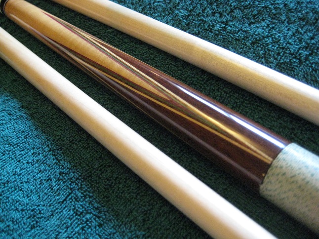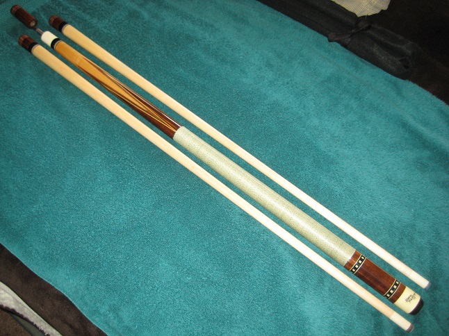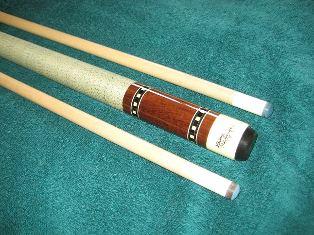 I am selling the Titlist conversion that I bought from Ben Mellinger about 10 years ago. Ben is a local Northwest cue maker who does excellent work. Very Meticulous! He comes from an engineering background which as we all know is the perfect foundation for a great cue maker. This cue was Ben's personal player and when I bought it he was in the process of making another player for himself. He built the cue from a one piece blank that he had been saving for several years. It appears to be dark Palm wood but not positive. Points are nice and even. The cue plays fantastic.. It has a radial pin. Ivory joint and ferrules with I believe Kamui tips. The wrap is actual Cortland linen that he bought from Joe Pechauer at the cost of about $100 for enough to do one cue. Butt is 15.5oz and shafts are 4.1oz/12.4mm and 3.7oz/12.7mm. Comes with the joint protectors that Ben made for the cue. You will not be disappointed with this cue. 100% Satisfaction Guaranteed!