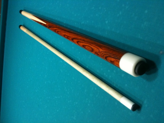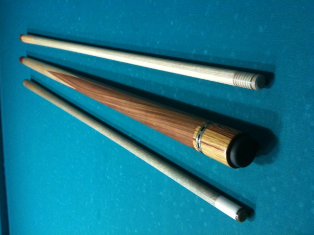 1.) Paul Fanelli 4 point sneaky pete. NO LONGER FOR SALE It has 1 orig. shaft (12.75 mm) with a Kamui black Super Soft tip. Black phenolic collars with a 3/8 10 pin. The forearm is maple with cocobolo and white Delrin butt cap. It has some dings on the forearm. The cue is straight together and apart. SOLD.