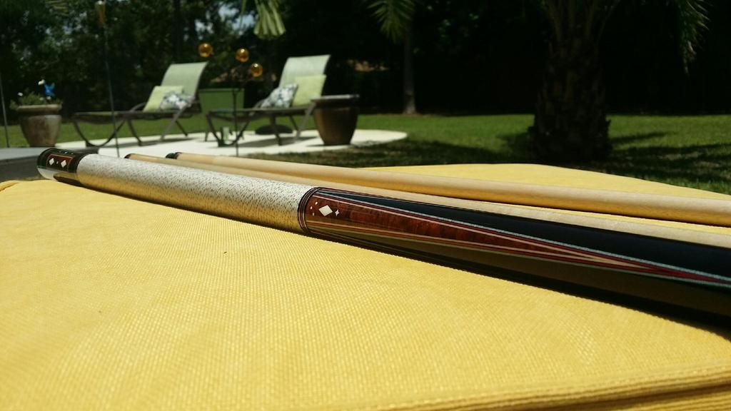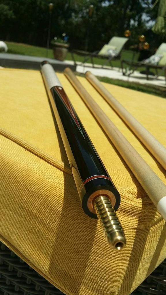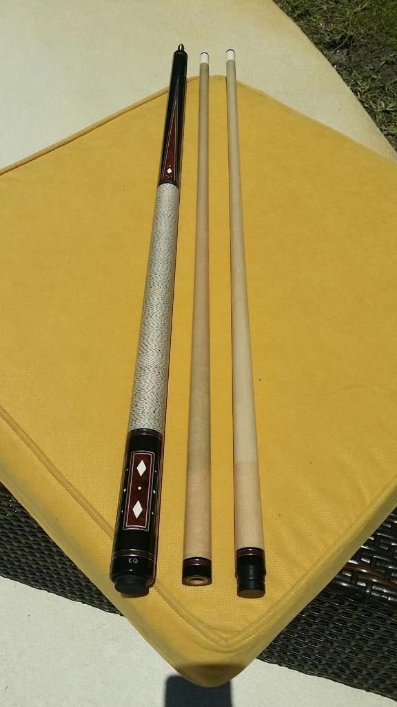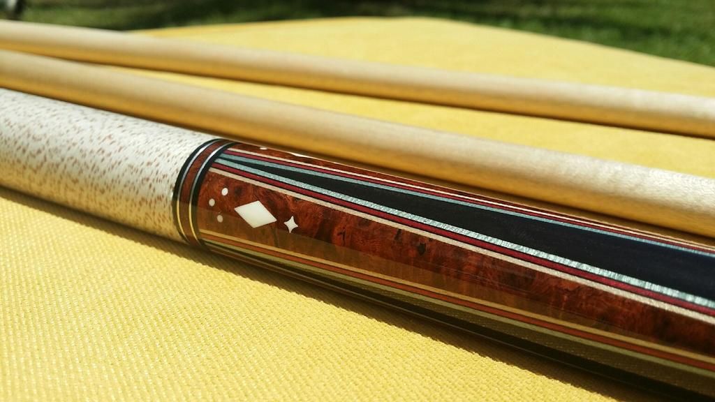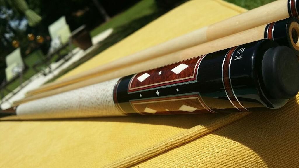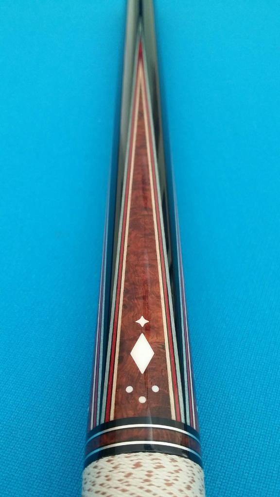 Up for grabs the best looking cue I have ever owned period. The built quality of this cue is second to none! Also she is an awesome player! 4 amboyna burl points into very dark ebony forearm. 4 perfect veneers in points and the boxes in the butt. All white is ivory. Condition is perfect no dings or a scratch. Only very light blue on the shafts other wise like new. ****** SOLD *******