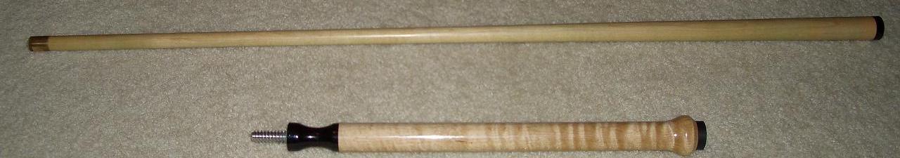 13.05 mm tip, 4 oz. shaft, 3 oz. butt, 40" total length, 5/8" brass ferrule, phenolic tip, 3/8x10 joint pin, 0.860" joint diameter. Finish is deep and glossy and really brings out the curly figure in the maple. The maple used has a lot of curls in it and is very tight grained. Has finger groove for dart jumping and a knob on the back for easy gripping. Rolls straight and jumps better than anything I've tried.