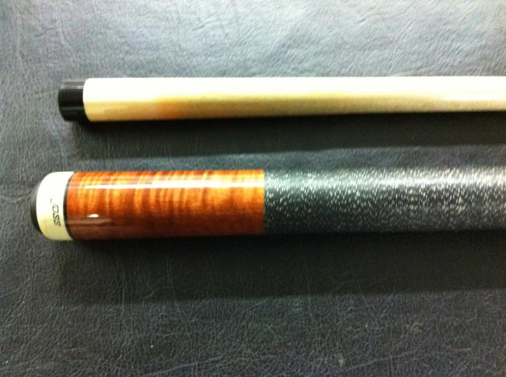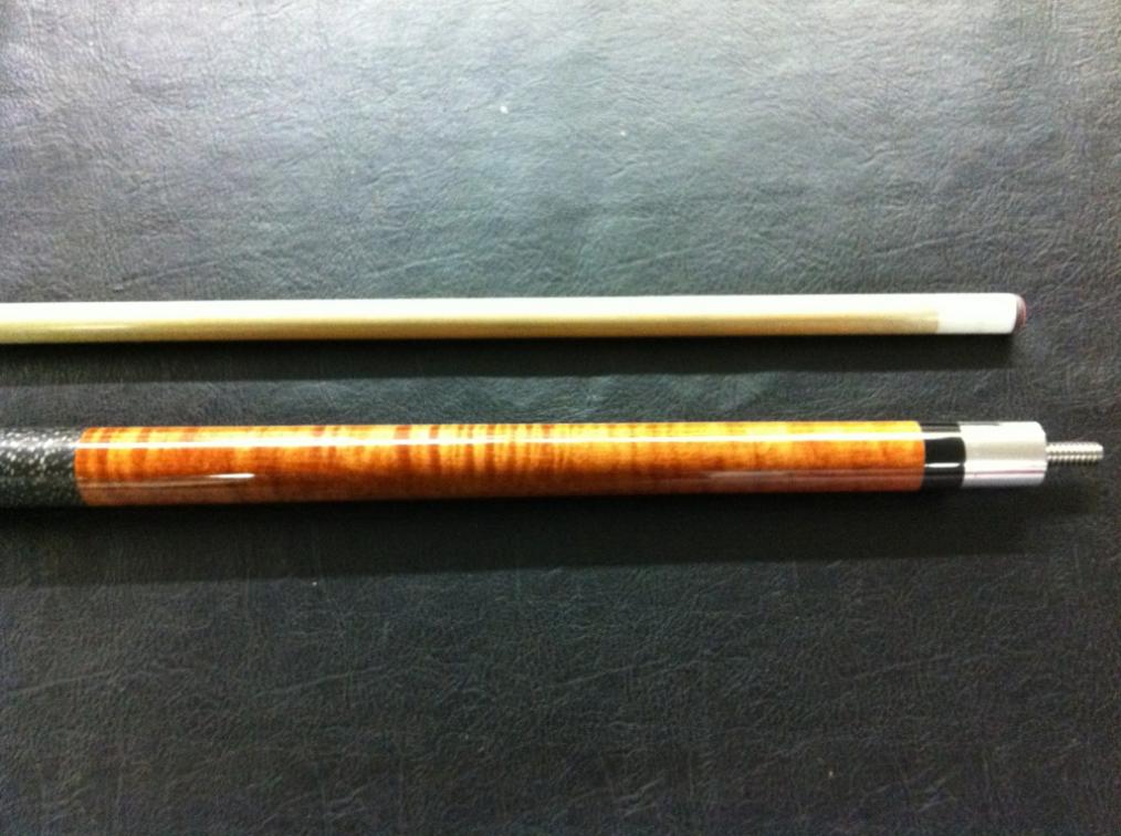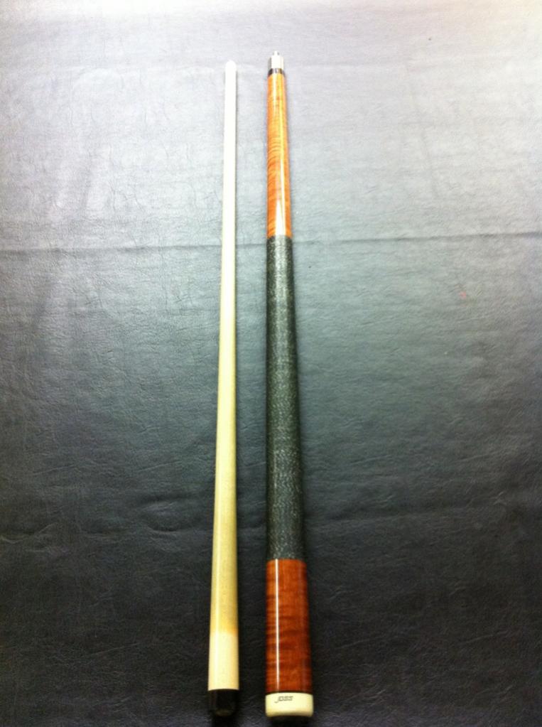 It looks to be a stained Curly Maple with a black and white linen wrap. Has a stainless joint with the Joss 5/16-14 tread.
