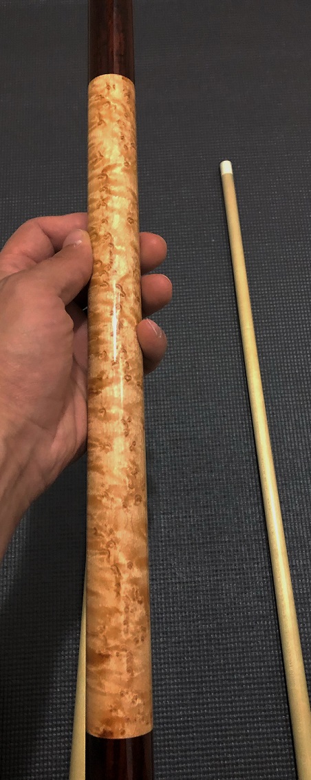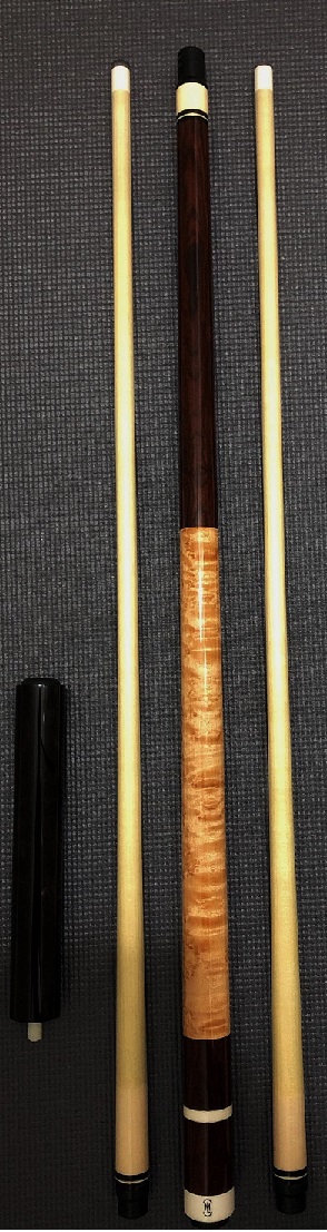 Lambros Merry Widow Cocobolo with a beautiful Birdseye handle. Butt is is excellent condition no dings, or scratches. One shaft has a scratch on the ferrule, and the other has a few light dings towards the tip. Overall the cue is beautiful. Rolls straight together and apart and plays just like a Lambros should.