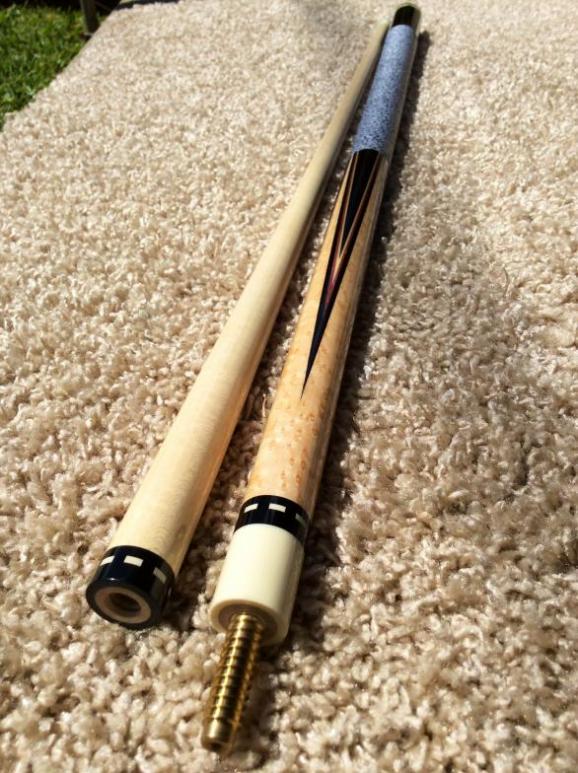 Leon Sly cue, like new condition, killer BEM, 4 point, hoppe ring, dashed ringwork, great balance, talked to leon sly and he said he only made 5 of these a few years ago, all with different colored veneers, just bought it off itzel last week, but irish linen's not my style, selling this in order to get a custom from leon