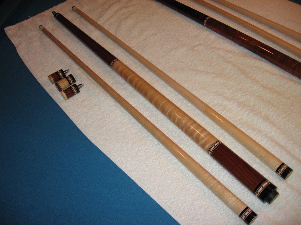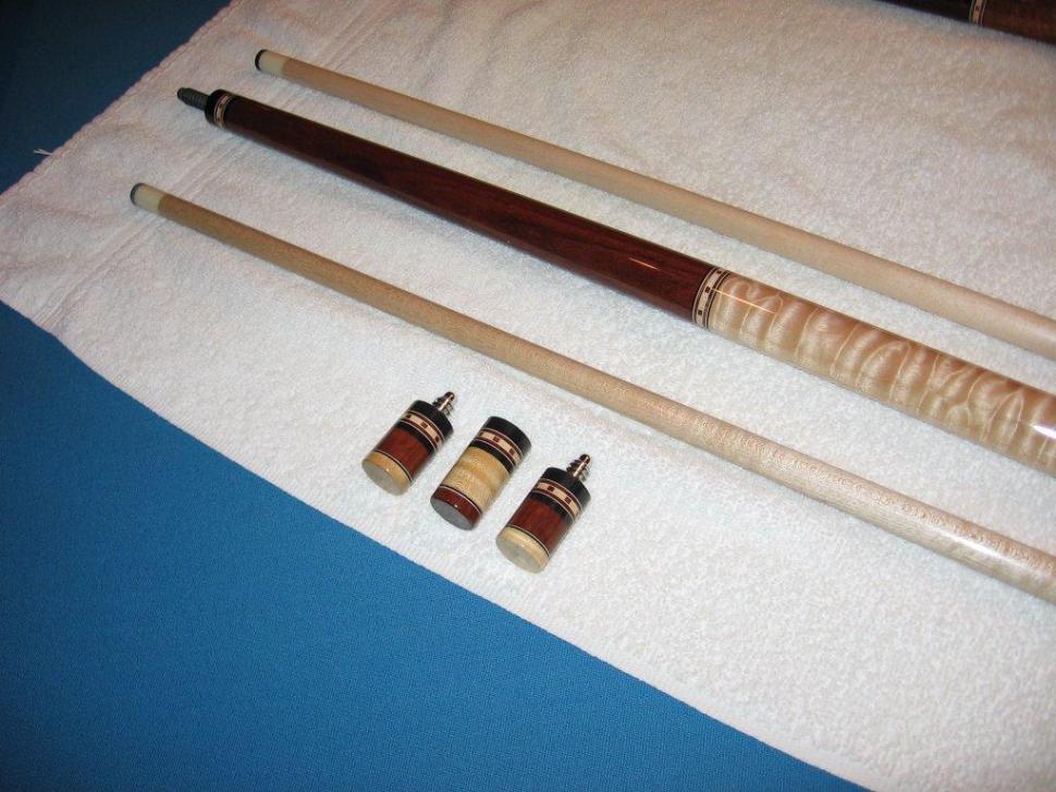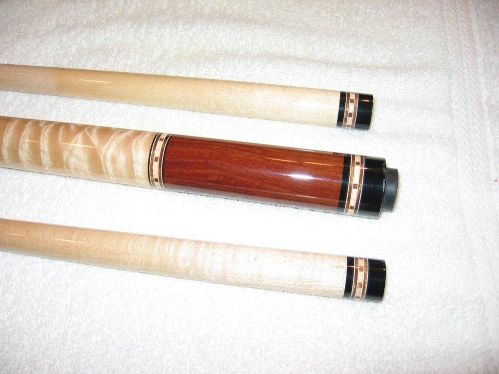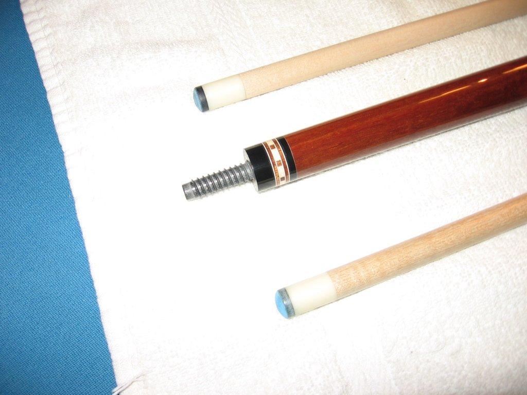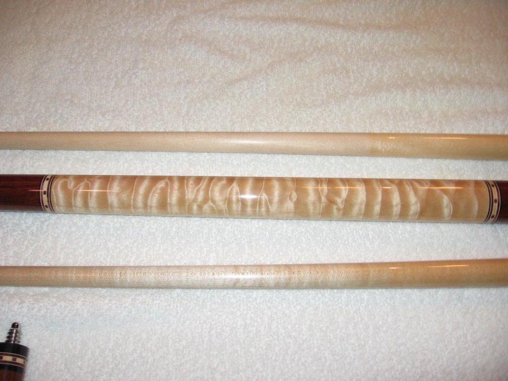 This cue is made with the the old Kersenbrock taper and specs with total length of 57.5 inches, split evenly between the 28.75 inch butt and shaft. This cue is a stiff hitter and really hits a ton. It rolls straight on the table and is in good shape, although the finish has lifted at the rings in places, as you can see in the pics. A search here will show just how honest I've been about the condition of my cues. This cue is a great hitter in good shape that with a refinish would be awesome. This cue comes with custom matching joint protectors.