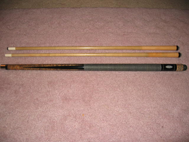 Im not real familiar with the Schulers/model #'s etc... It has a very tight joint,Hits pretty good. Its has what appears to be 4 ebony points? Irish linen wrap, and comes with two shafts. The butt edge has been trimed by me due to a sm chip in the butt material. I would guess this cue weight is around 19oz. One of the ferrels is ivory and does not have a tip on it...the other ferrel is approx 1.1/4 inch and not sure of the material. Both are 12.5mm. over all condition is pretty good. 375.00 shipped priority mail