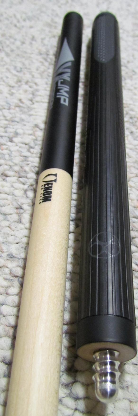 Jump/Break cue is a Poison VX 2.9 in black. There's some light scratches on the forearm, but have to look for them to find them. Around 19 ounces. Rolls straight. $Being bidded on ebay. Good luck if you are part of the auction!$