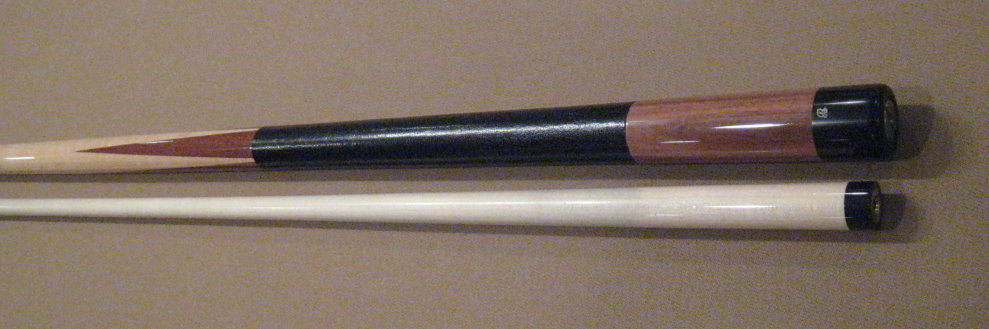 The butt and shaft are straight both together and apart. Cue has a nicely done perforated (small) leather wrap. Black phenolic collars at joint and shaft, black phenolic buttcap with the stylized combined "RB" logo. Cue is a bumperless style with exposed weight bolt - a nice look!